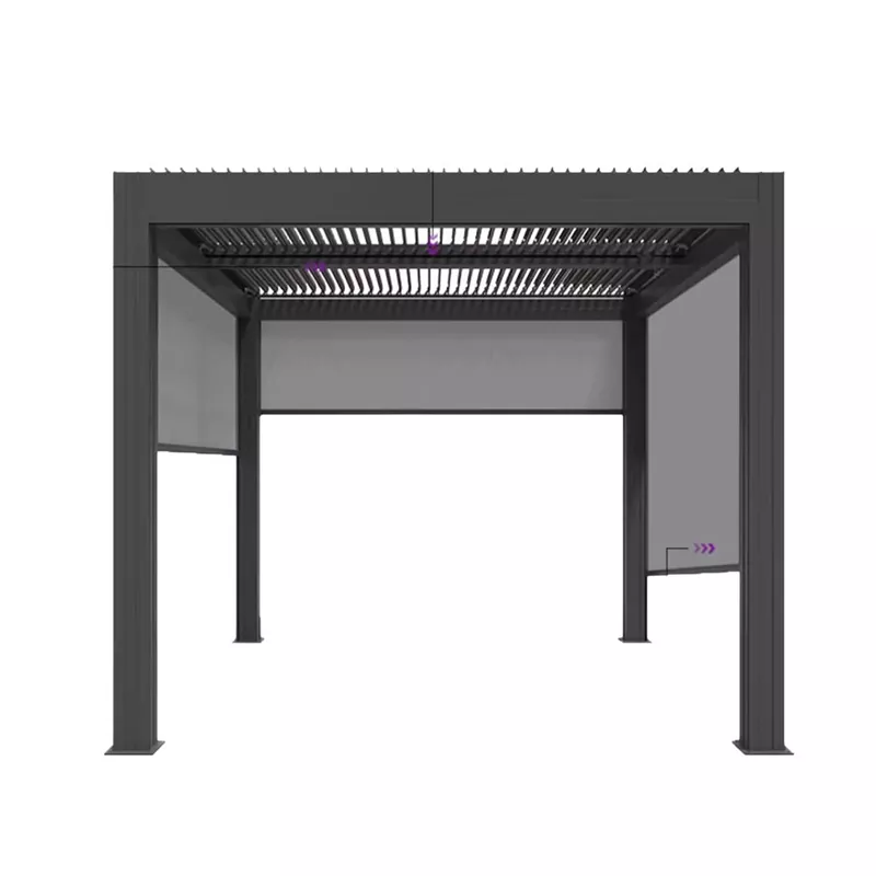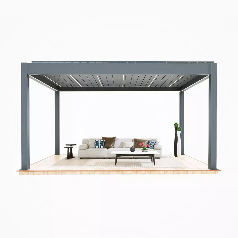 The core advantage of the intelligent control pavilion lies in "minimalist aesthetics + intelligent core". Based on streamlined line design, it integrates modules such as intelligent sunshade, lighting, and wind and rain induction invisibly, retaining the transparent and neat minimalist appearance while achieving full-scenario automatic control. The main body is made of lightweight aluminum alloy profiles with matte fluorocarbon coating, balancing weather resistance, corrosion resistance and texture. The intelligent components adopt IP65 waterproof design, adapting to complex outdoor environments. It can be remotely controlled via APP and operated by voice commands, realizing functions such as automatic opening and closing of the sunshade, gradual lighting change, and automatic closing in response to wind and rain, balancing convenience and technological sense.